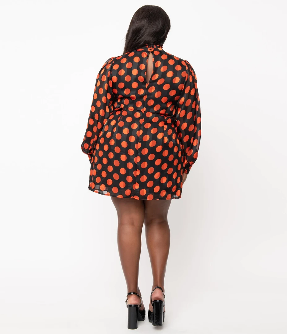 Adorably cute and retro minded, this sweet silhouette from Smak Parlour boasts a Halloween perfect orange polka dot print throughout a black backdrop. Crafted in a lightweight striped crepe, the darted bodice and slightly tapered waist lends a dash of form while the high ruffled neckline is secured in the back with a button keyhole. The billowing long sleeves are cinched with a button cuff while the shortened hemline creates a beautiful shape!