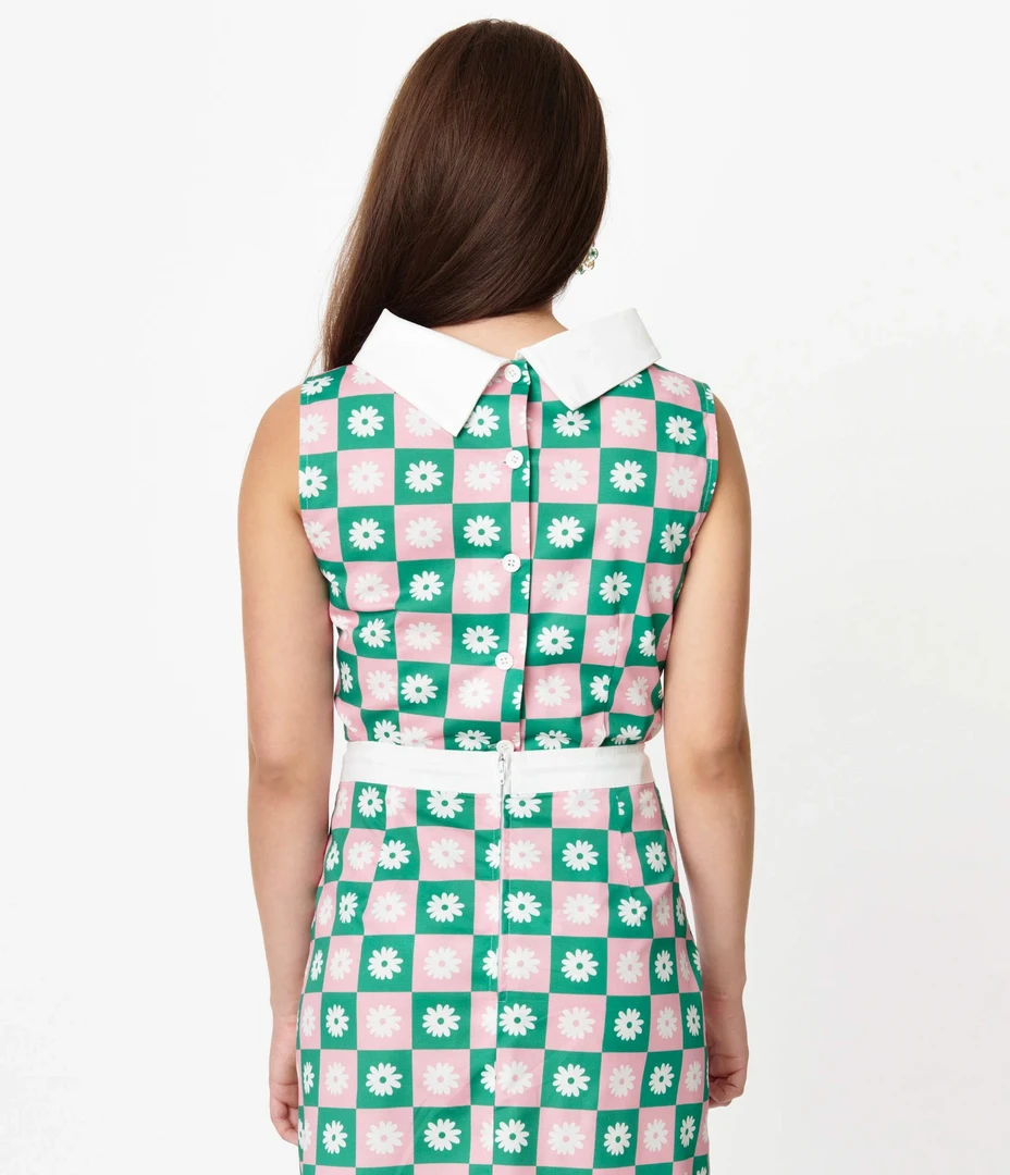 Checkmate! This fabulous 1960s inspired top from Smak Parlour is crafted in a sturdy woven fabric that dazzles with a green and pink checkered backdrop, complete with white daisies throughout. This sleeveless top is secured with sweet buttons down the back, just like your favorite vintage top! Pair with the matching mini skirt for the complete set!
