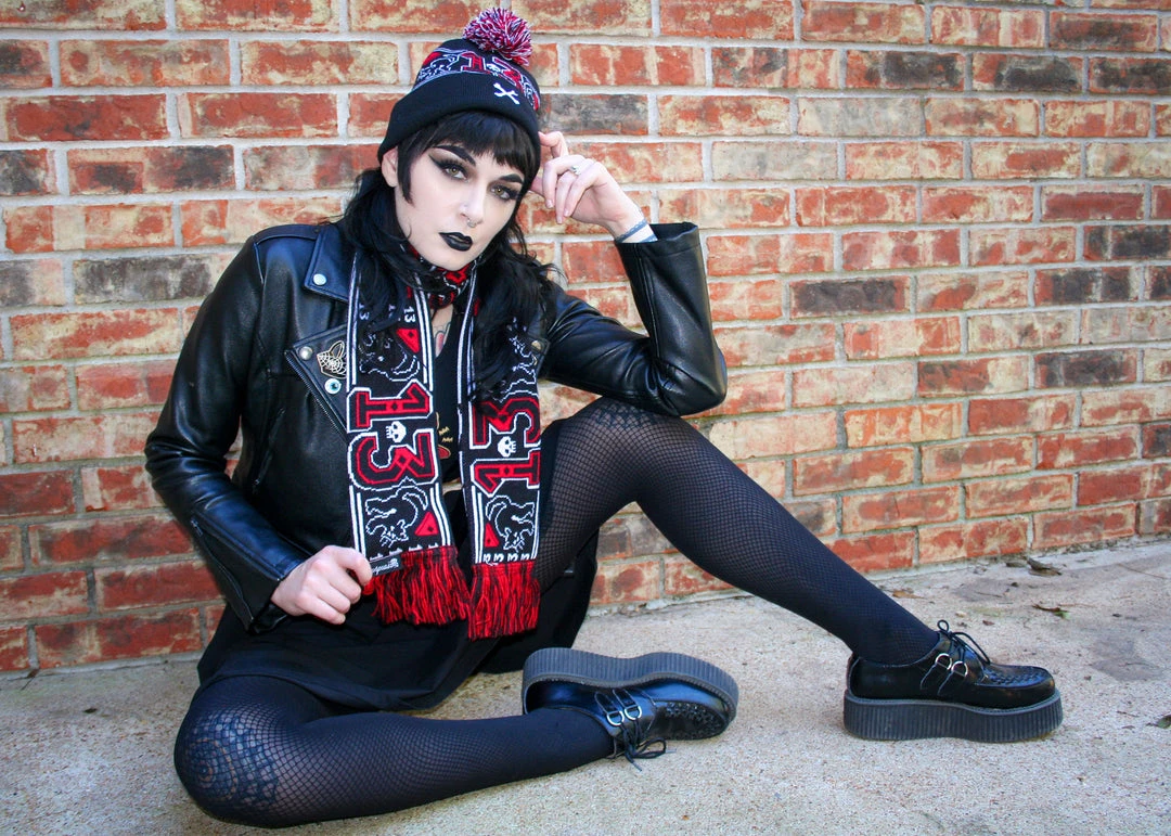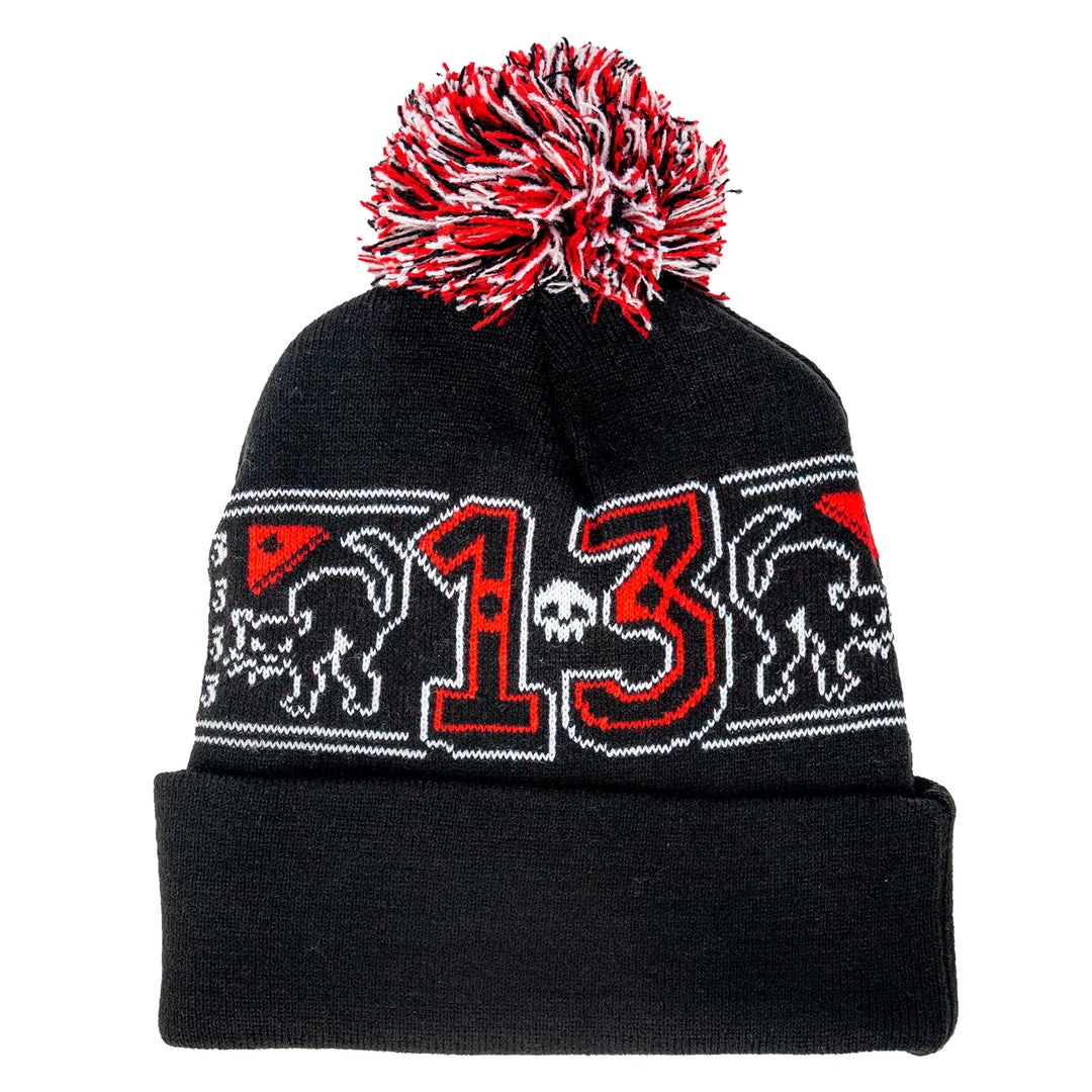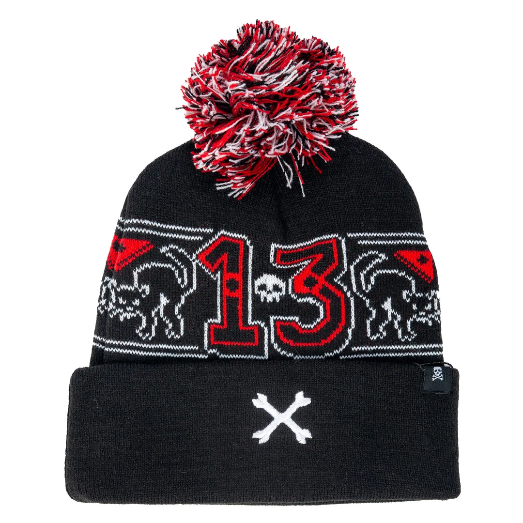 Staying warm this winter is much better when wearing the new 13 pom pom knit hat. Made in our favorite color combo, black with red and white. Black cats, skulls, crossbones and our favorite number 13.