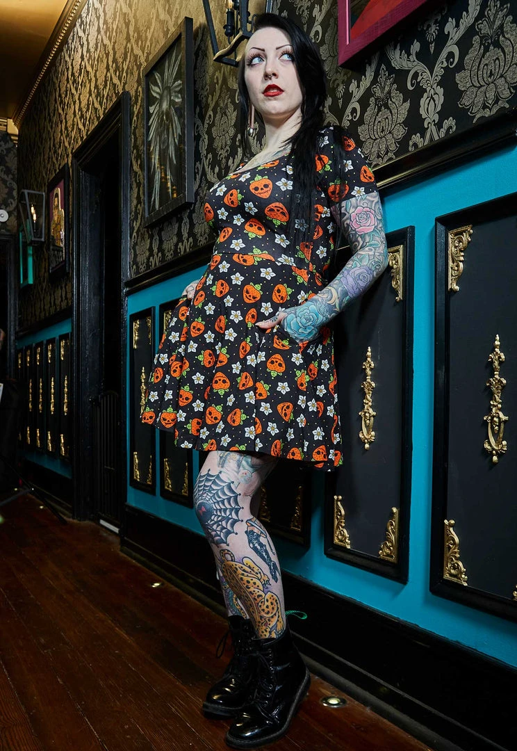 The Berry Dead Skater dress is the perfect combination of spooky and cute! It features a flattering scoop neckline, little skull strawberries and flowers, and pockets! This print was designed in-house and is exclusive to Sourpuss!