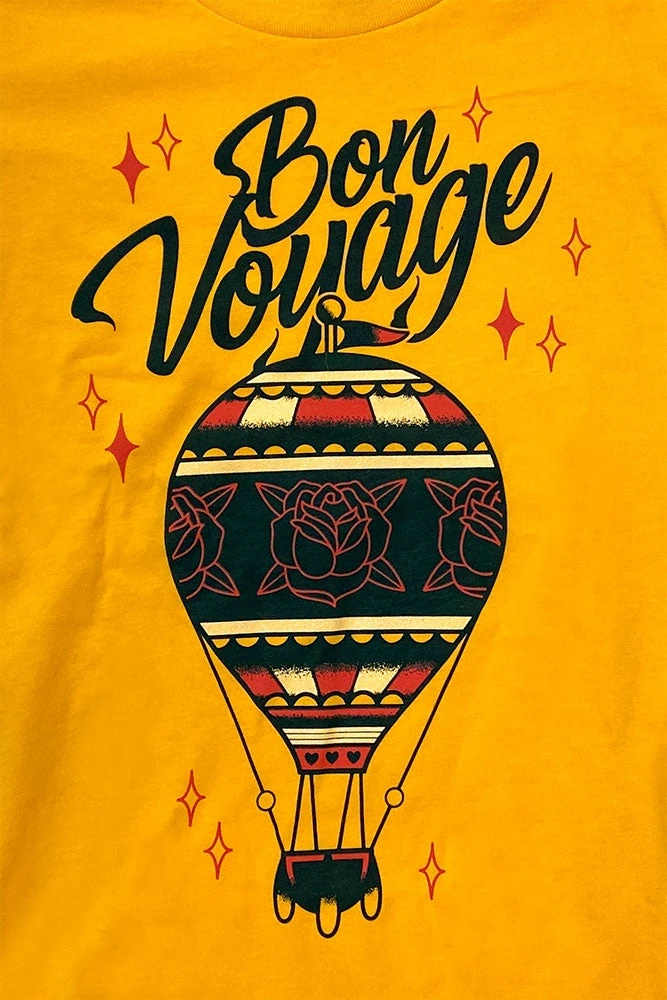 Bon Voyage! Who is ready for a vacation? Sign me up if it involves this gorgeous rose tattoo hot air balloon. This Sourpuss graphic has a retro vibe with the diamond accents. Printed locally with the softest inks on a gold colored Next Level Apparel boyfriend tee. This is a retail exclusive!