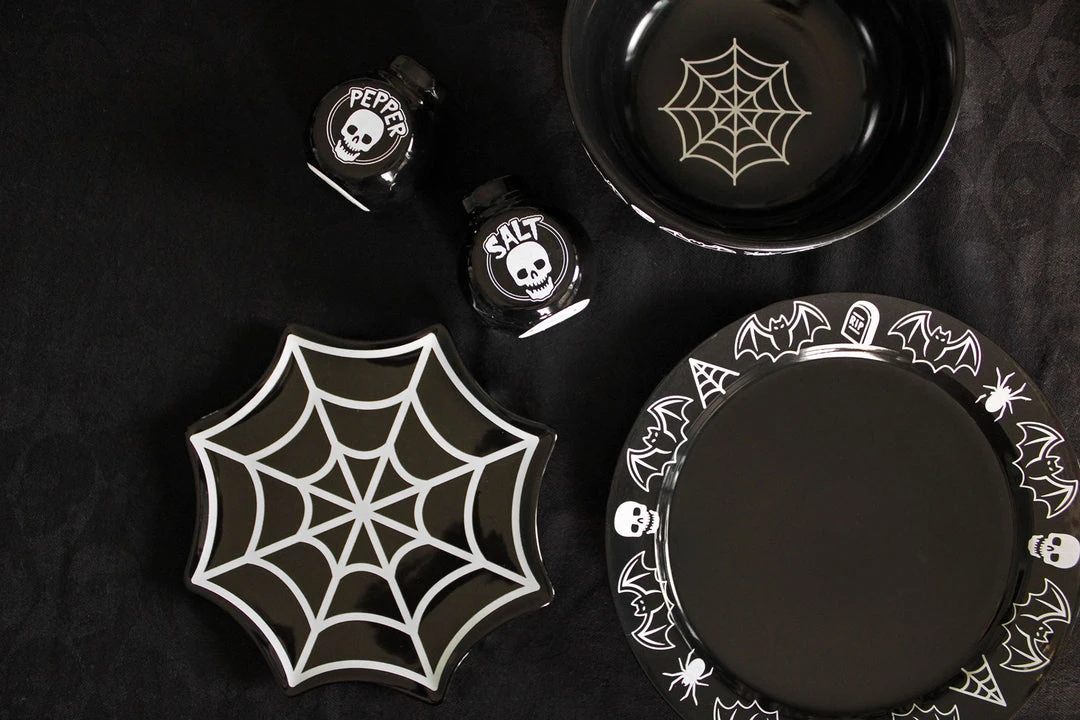 We’ve designed a creepy and cute bowl to enjoy your soup cereal or popcorn. Made of a shiny black ceramic and printed with skulls, bats, spiders, webs and coffins. Inside of the bowl is printed with a spiderweb.