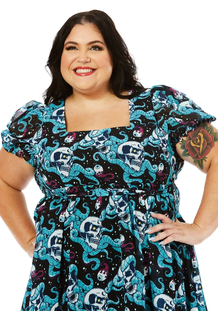 Sometimes, dead is better.. at least when it comes to our new Dead Sea Cream Puff dress! This floaty, dreamy dress features the art of Marcos Cabrera, created especially for Sourpuss – you won’t find this print anywhere else! The Cream Puff dress is a brand new empire-waist silhouette; with fluffy puff sleeves, a fully smocked back, and a waist tie, this one has all the bells and whistles you could possibly need!