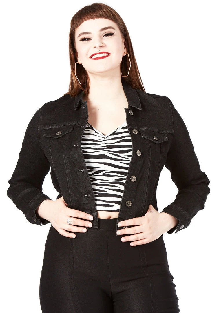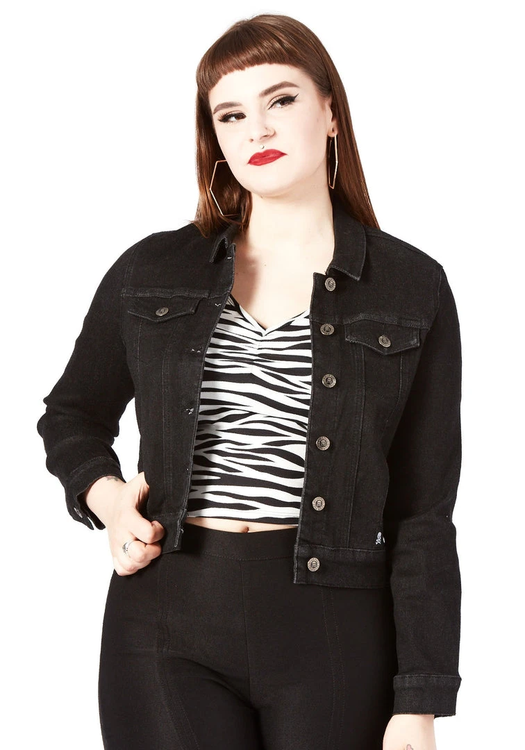 Every ghoul needs a perfect black jacket in their closet! The new Essential Stretch Denim Jacket in Black is the ticket! This comfortable, stretchy denim jacket features side pockets, an inside pocket, and branded Sourpuss hardware. It’s a perfect all-season jacket that you’re going to want to get your claws on immediately!