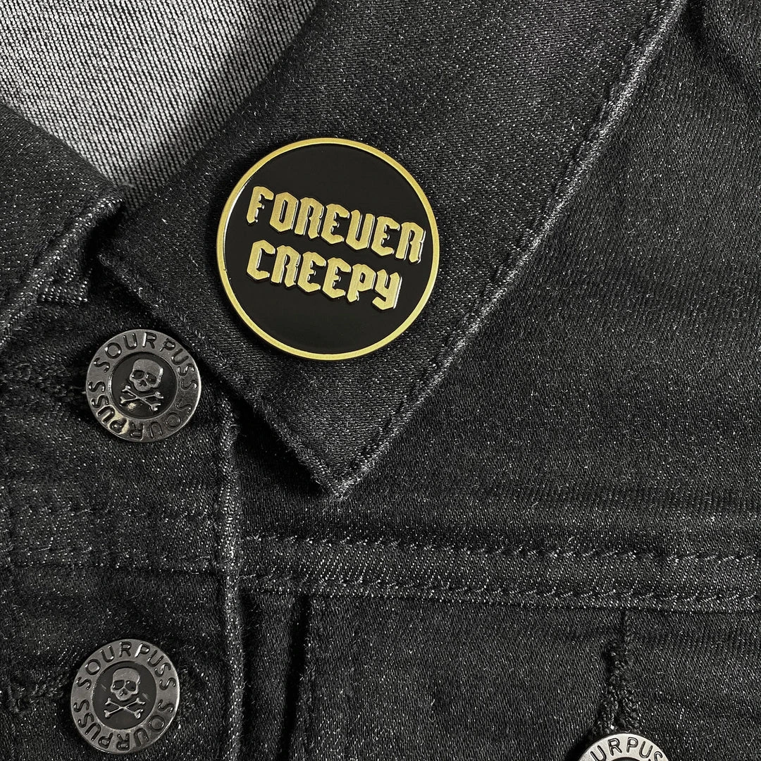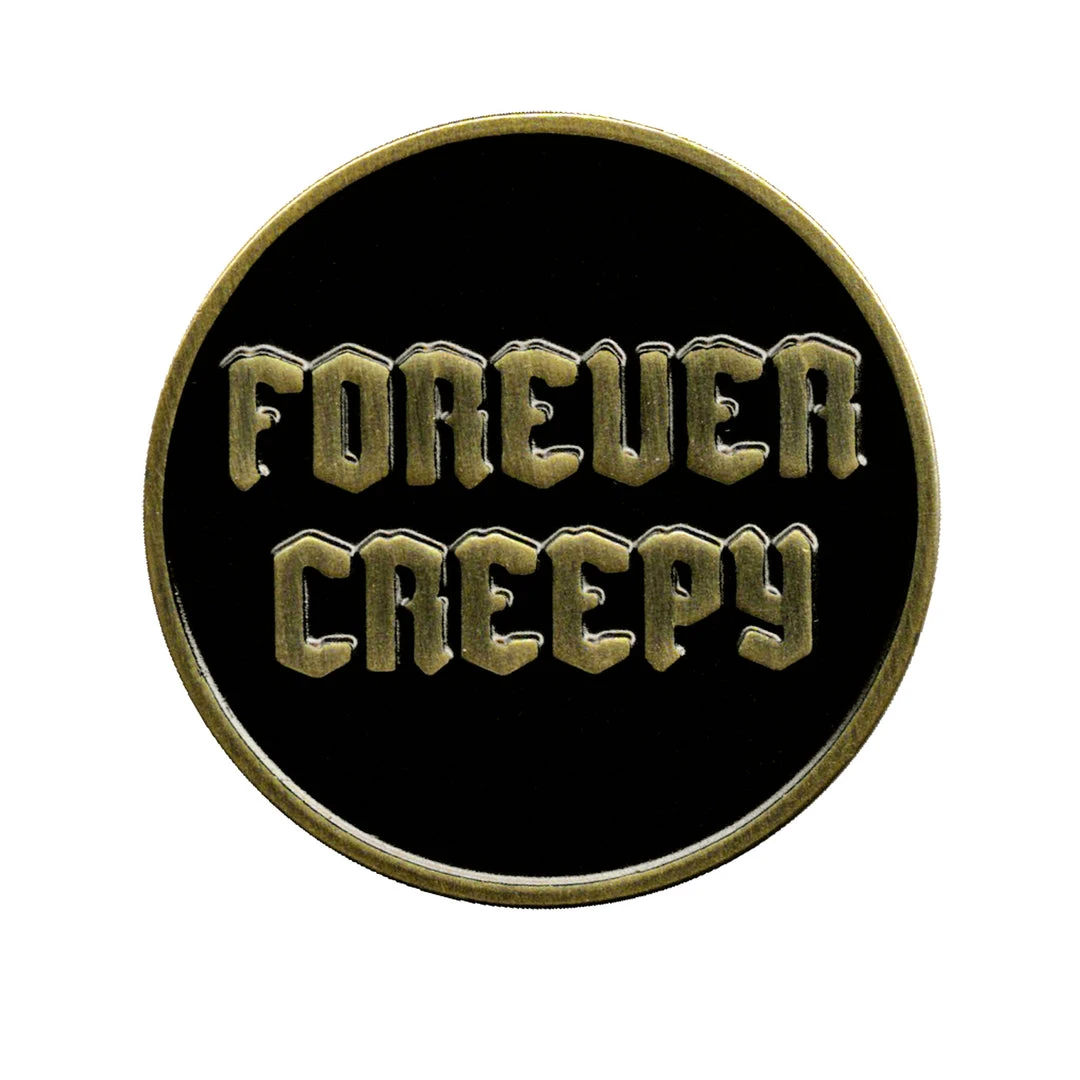 What can we say, we are what we are! The Forever Creepy enamel pin is simply perfect, complete with black and gold soft enamel and rubber pin backs. Great on your favorite vest, jacket or tote!
