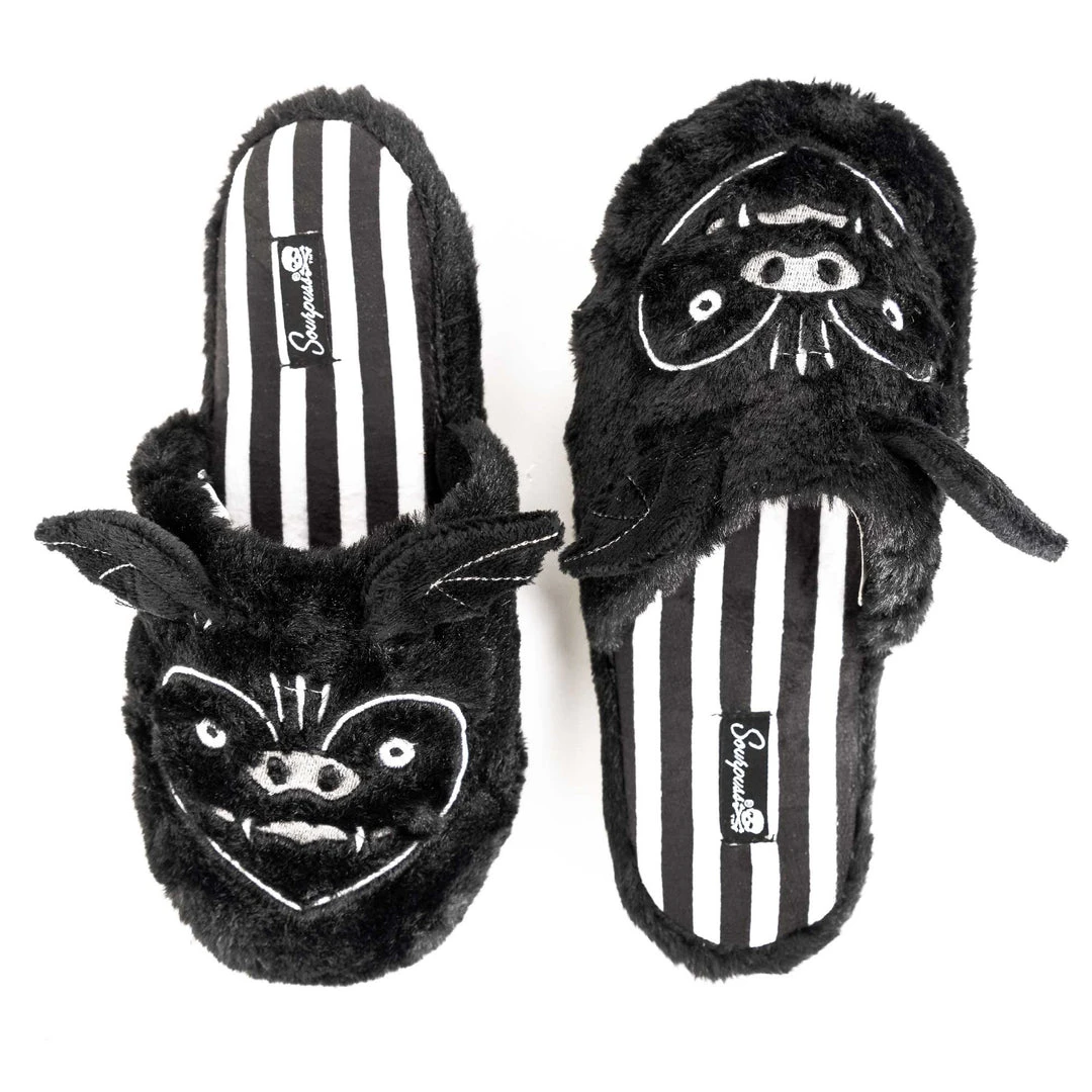 Lounge about your bat cave in spooky style with our adorable Furry Bat Slippers! Designed in house and made of a soft and plush black faux fur, they feature embroidered details, little bat wings, and our signature black and white stripe lining. A memory foam lined cushion bottom keeps you comfy.