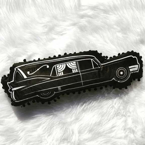 Hitch a ride to the other side with our Hearse Shaped Pillow! This soft & plush throw pillow will add some seriously spooky cred to your decor, featuring a retro-inspired Death Cab that looks ready to roll right into your home. The front imagery is digitally printed, for a vibrant and long-lasting design, while the back is solid black and the whole package is trimmed with fun pom-poms.