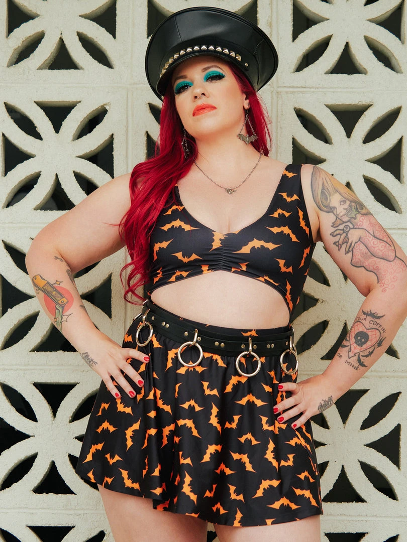 Your favorite new Summer staple has arrived! Our new swim skirts not only match our new Monokinis and Scrunch Bikinis perfectly, they also look amazing on their own! The Luna bats swim skirt in black and orange will take you through every season!