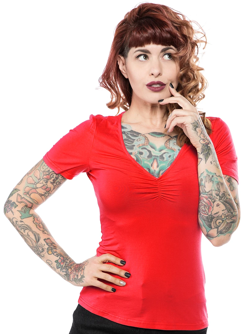 The Ramona Top is the perfect wardrobe staple that every pinup needs! It’s made out of a soft stretchy rayon knit, and has short sleeves and a plunging neckline. It looks amazing tucked in or out, and will go with virtually any pants or skirt!