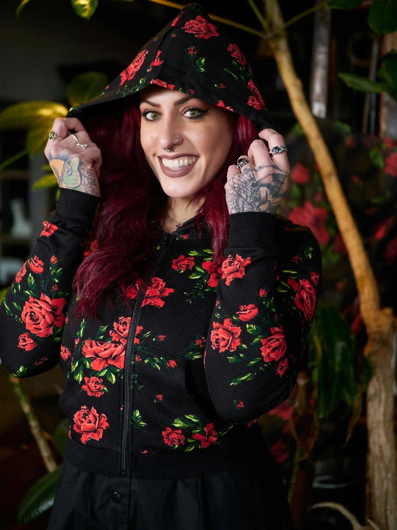 There’s no such thing as having too many hoodies in your closet, am I right? The new Rose Garden hoodie is the *perfect* new addition. It features a dreamy red rose print on a stark black background. It has a giant oversized hood, a zip closure and of course, pockets!