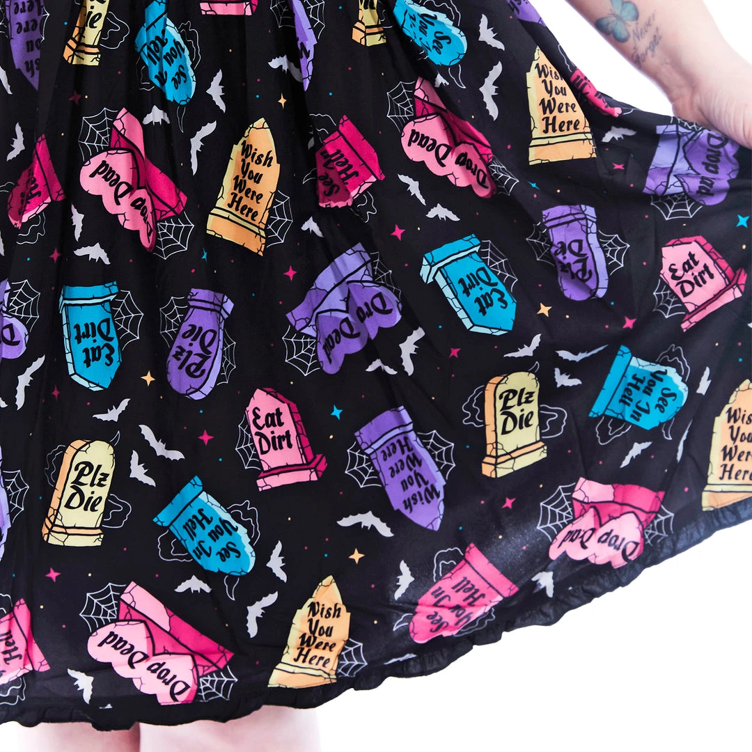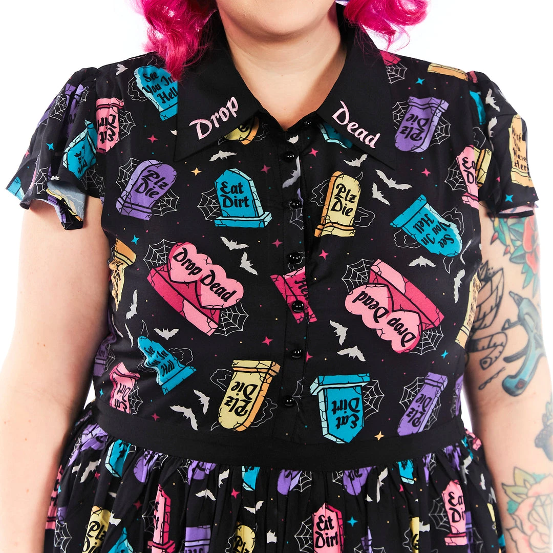 We believe in wearing our feelings on our chest here at Sourpuss, so we’re delighted to bring you the Rude Tombs Lydia dress! This dress is adorned with colorful tombstone art with messages for creepy strangers, your least favorite coworker, etc. We’re also pretty tickled with the “Drop Dead” embroidery on the collar! This dress has minimal stretch, an invisible side zipper, full lining, and POCKETS!