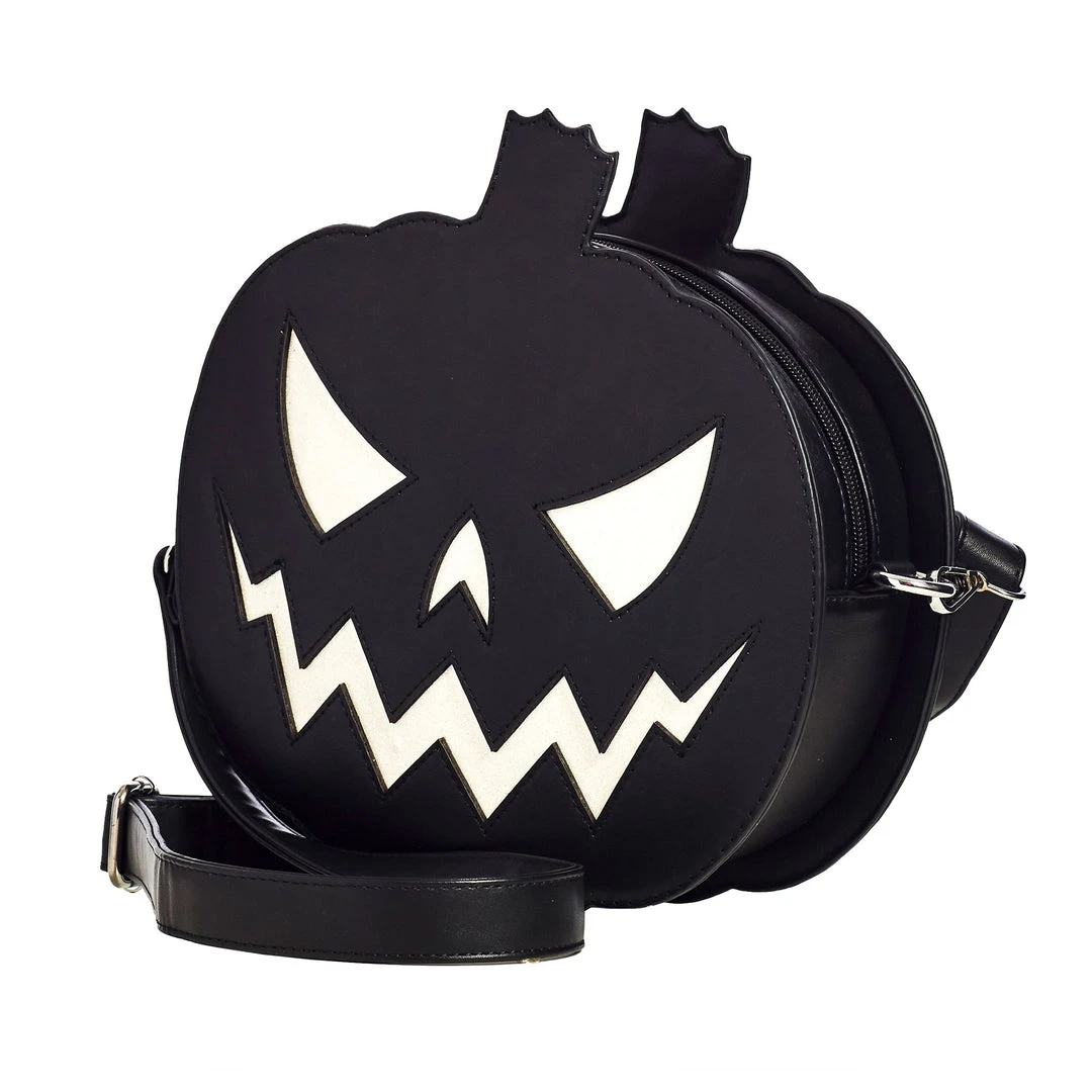 We love a good black/white combo, so we designed the new Sparkle Pumpkin Purse with that in mind! The body and adjustable strap are made out of a matte vinyl, and the jack o lantern face is stitched out of a sparkly white vinyl. Inside, the purse is lined with leopard print and has a zipper pocket for stashing your loose change! Turn the purse around and you’ll find the mini Sourpuss metal emblem. The sparkle pumpkin purse can be worn as a cross body or over the shoulder.