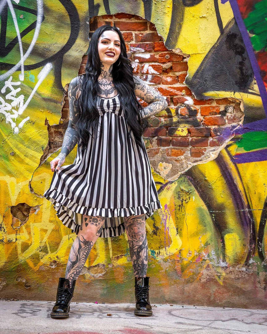 You’ll be the ghost with the most (dresses) in the new Striped Hi-lo Dolly dress! This style has a slight waterfall hem (longer in the back), an empire waist silhouette, and a sash tie that can be tied in the front or back. The back bodice is fully smocked so there’s extra stretch since the fabric itself has no stretch. It’s sure to be a new wardrobe staple!