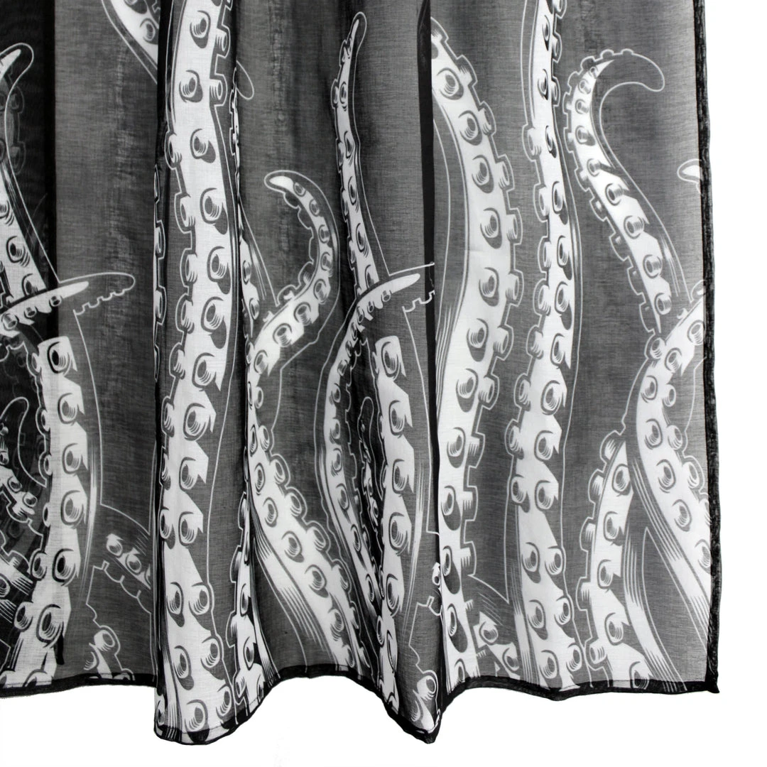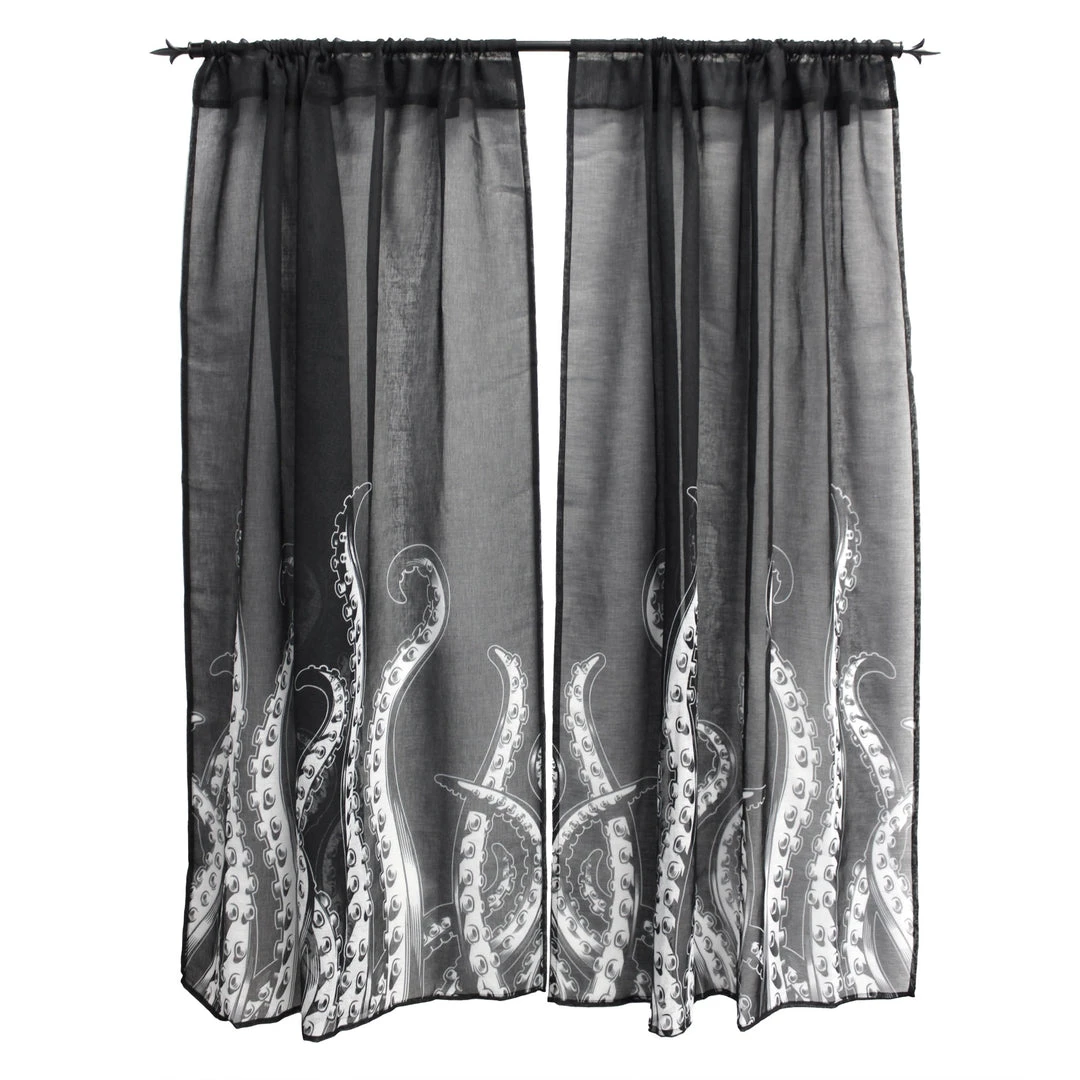 We had to travel to the depths of the ocean to bring you these new Tentacles Window Curtains! These AMAZING curtains feature our popular Sourpuss designed tentacles, printed on black, semi-sheer curtains. They are sold in a set of two and have a tunnel at the top for your curtain rod.