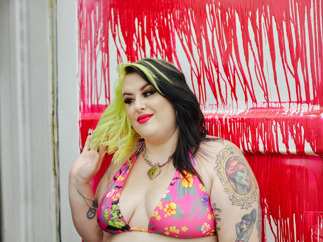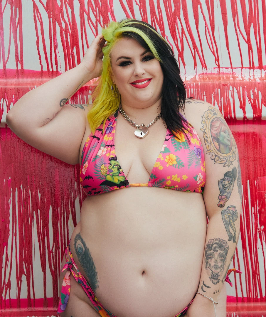 Artist Kelly Migliori has done it again with the new Tropighoul print! The Tropighoul Scrunch Bikini has adjustable ties on the top and bottoms, and a little scrunch along the back seam for a cheeky fit. The print features Frankenstein’s Bride, Bats, and some tropical flowers!