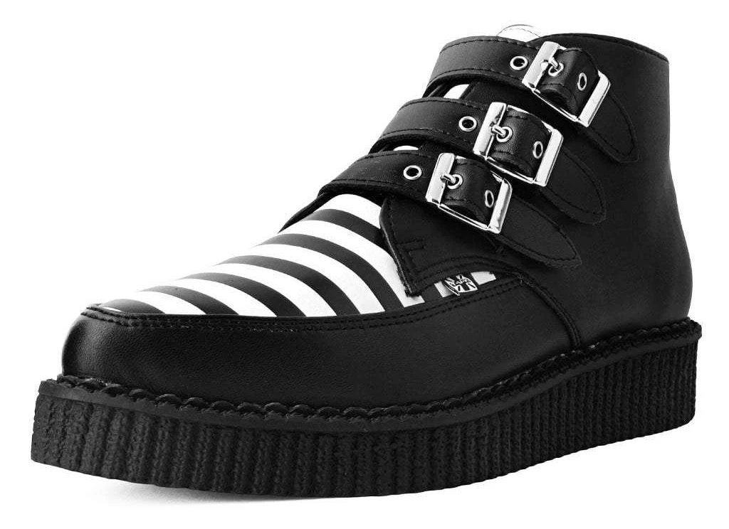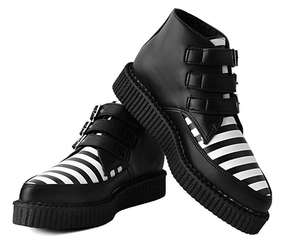 A vegan friendly style to kickstart your week! Buckle up in fierce style with these creeper boots featuring a vegan friendly black and white striped upper. Triple buckle strap closure and has a low sole creeper platform that measures 1.25” at the heel and .75” in the front and has removable memory foam insoles for added comfort.