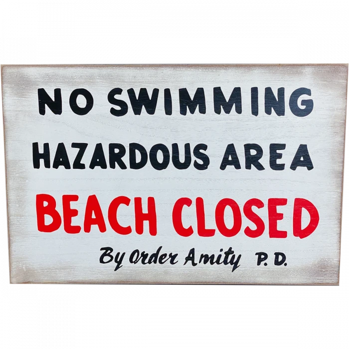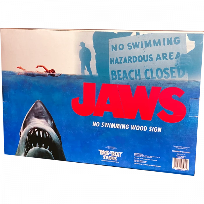 Warn your friends about the monster that lurks in the waters of Amity Island with this officially licensed Jaws No Swimming wood sign from Trick or Treat Studios. This beautiful sign is made in solid wood with a bright solid landscape and printed design and has a hook in the center for easy hanging.