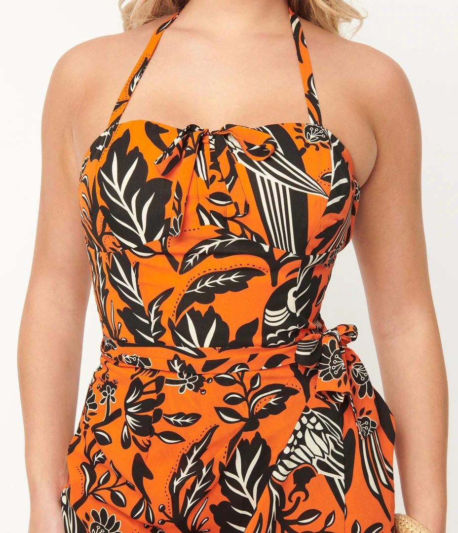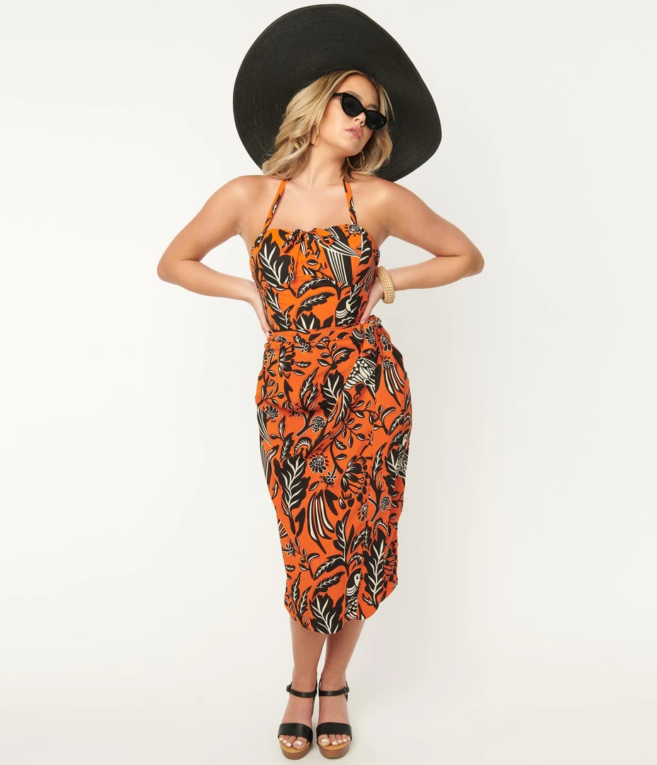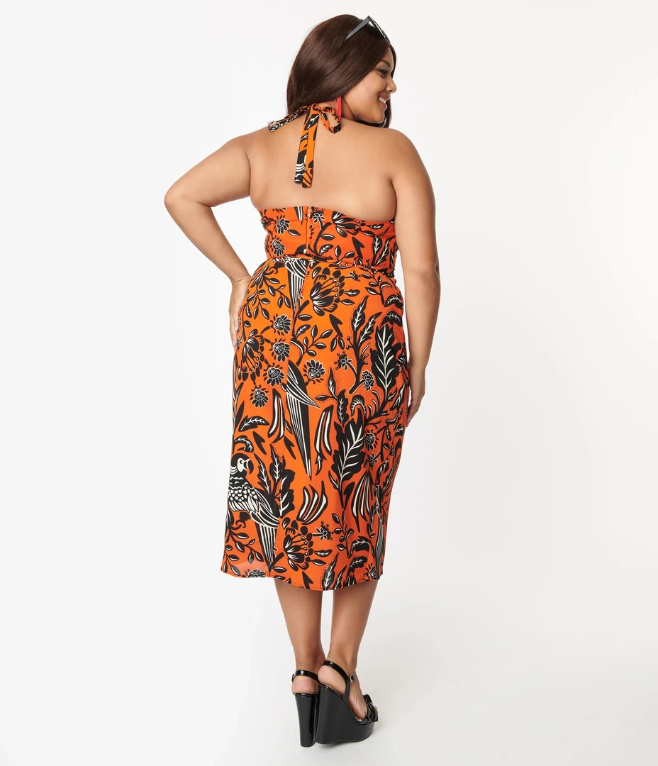 The tropics are calling! This striking Leilani Sarong Dress from Unique Vintage is crafted in a lightweight crepe that features a tropical print with parrots prancing throughout a vibrant orange backdrop. Outfitted with boning, a removable and adjustable halter strap, dual side vents, a faux wrap style with attached ties, and a side zipper.