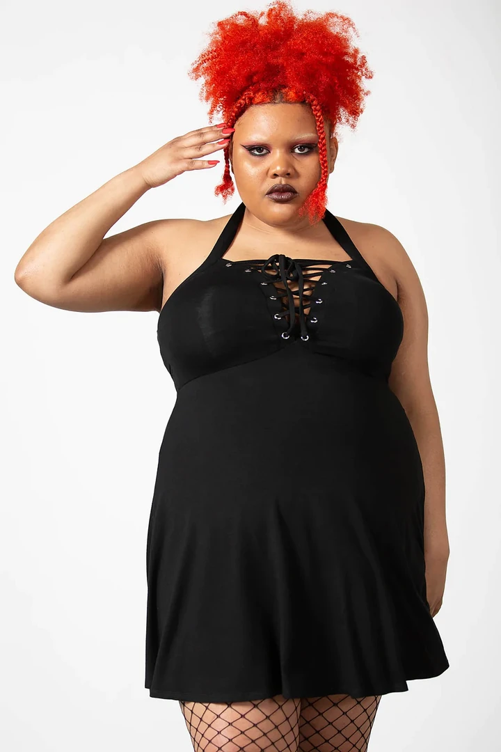Lace ’em up and go in the Gothica Halter Dress from Killstar. This super easy to wear dress is made of a solid black soft, super stretch, flowing fabric complete with statement lace up detail. It has a halter neck with D ring closure and looks great layered over fishnet tops too!