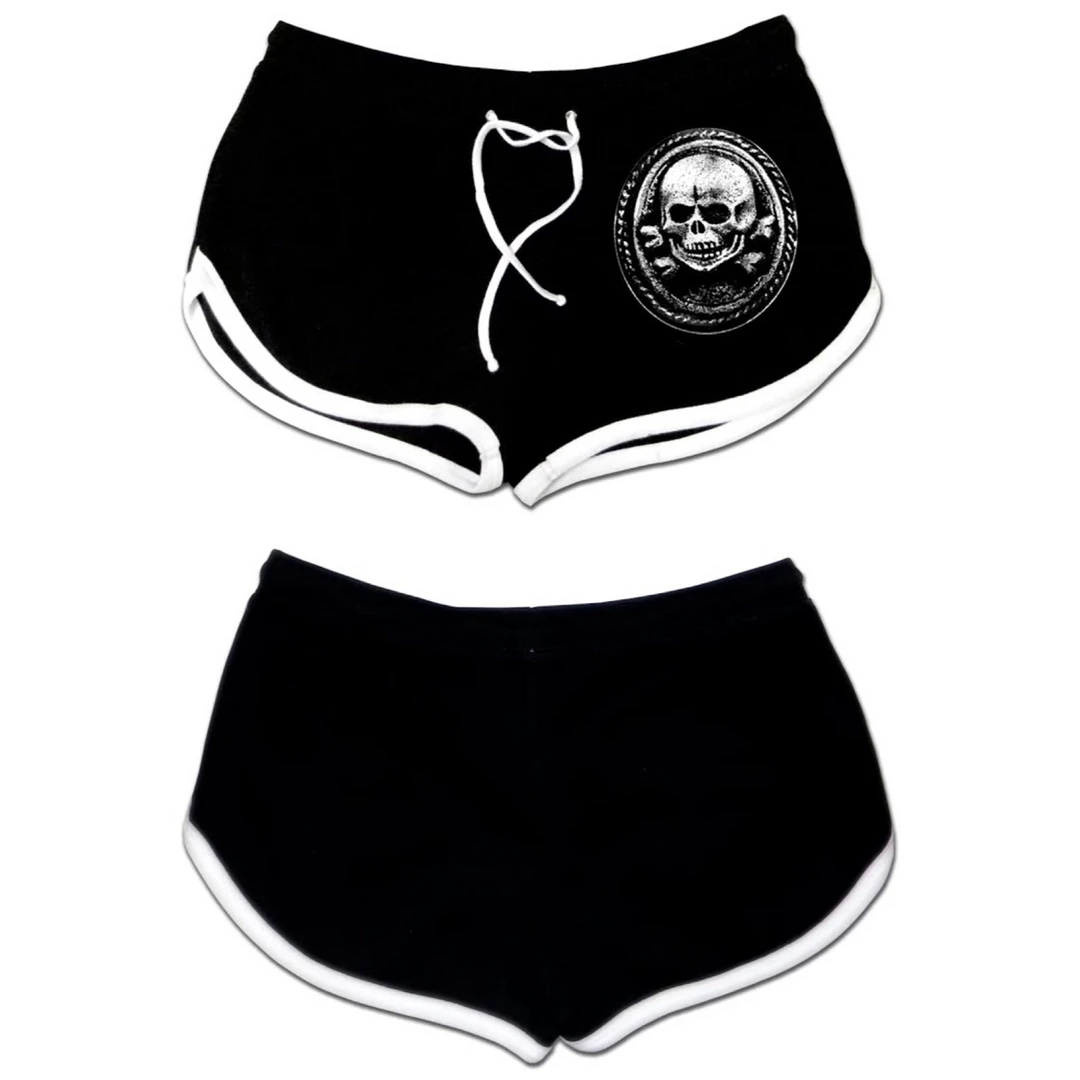 Death or glory! With that retro gym short styling we love, these soft knit black shorts from Pinky Star feature a skull and crossbones graphic on one leg, drawstring waist, and a flattering dolphin hem fit complete with contrast trim.