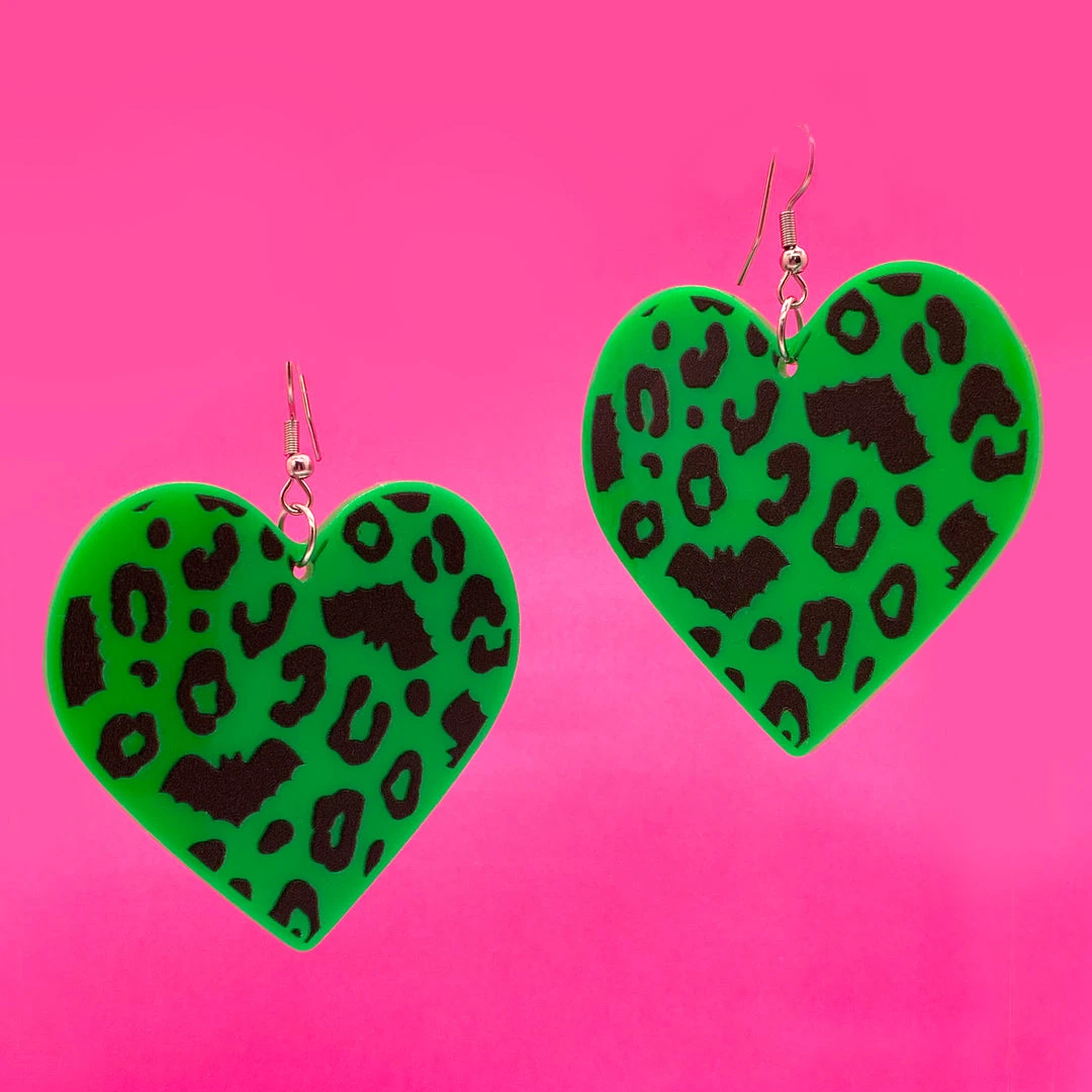 We’ve combined two of our favorite things, bats and leopard print for these killer heart shaped earrings! At 2″ x 2″, they are definite statement makers made of a bold green acrylic with metal ear wires. Suitable for traditional pierced ears.