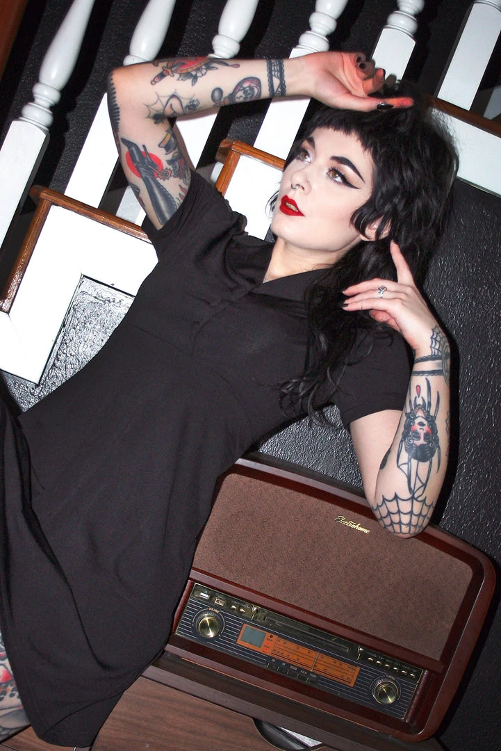 We can’t believe that this is our first ever solid Black Rosie dress, but it’s definitely worth the wait! The Rosie is one of our most popular styles – it’s made out of a super stretchy and lightweight poly spandex knit, with a 1940’s inspired silhouette, 3-button front closure, and a Sourpuss flag label sewn on the sleeve. It’s going to be a must-have for your wardrobe!
