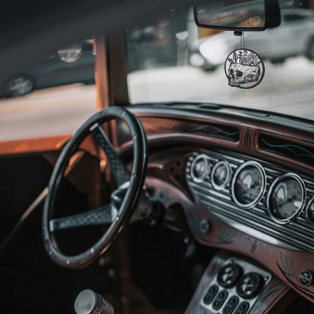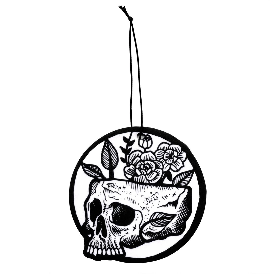 Something witchy this way comes. Spookify your car with our Floral Skull Air Freshener featuring exclusive artwork by Villy Villain. It has a great woodsy forest scent.