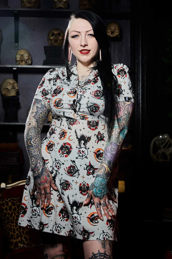 Black cats are the best, so naturally we had to create a new Rosie dress featuring our favorite felines! The Friday the 13th Rosie dress has artwork by Jared Gaines, with black cats, horseshoes, skulls, the works! We love the washed out gray background and perfect traditional tattoo style colors. The Rosie dress has a 3 button center front closure and is super stretchy for a perfect fit!
